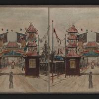 Mounted hand-tinted stereograph showing the Chinese Arch on Swanston Street. It is part of the G. H. Myers Collection which consists of 73 photographs taken by Godfrey Henry Myers, an electrician and amateur photographer, in Melbourne during May 1901. 72 of these photographs depict preparations for the celebrations that surrounded Federation; all but one are glass stereographs. Designed by a Western architect, George Austin, the Chinese Arch reproduced pagoda architecture as depicted on the familiar willow-pattern plate. The arch, funded by the Chinese community, had tiers of red tiles, was covered in splendidly coloured silks, and was adorned with hanging (unlit) lanterns and silk banners. At night a Chinese band playing traditional music played in the band room over the central arch. Musicians playing gongs accompanied them from the towers. The subsequent addition of 14 printed stereograph photographs compliments the existing holding of Myer's glass stereograph negatives. This collection represents Myers' one venture into commercial photography. It is significant for its images of the crowds, which do not feature so prominently in commercial photographs. The remaining photograph is a family portrait. The opening of the Australian Parliament on 9 May 1901 was an occasion for great celebrations in Melbourne. Ten days of festivities (from 6-16 May) were planned to mark the Federation of the new nation and honour the Royal visitors, the Duke and Duchess of Cornwall and York. The city was transformed with decorations - flags, bunting, colourful lights and festive arches - and a series of public events were held, including a military tattoo and several street parades. Unprecedented numbers of people arrived in Melbourne from the rest of Victoria and throughout Australia to take part in the celebrations. Description of Content Chinese Arch, Federation Celebrations, Swanston Street, Melbourne, May 1901. Physical Description Black & white stereographic photograph mounted on cardboard backing printed with publisher details. Significance Commercially printed examples of amateur photographer G.H. Myers' stereographic photography, represented in the collections through a series of 72 stereograph glass negatives. They offer an interesting and rare representation of events and social activity at the time of Australian federation. Acquisition Information Donation from Mrs Patricia Fraser, 20 Apr 2010 Photographer Godfrey H. Myers, Melbourne, Greater Melbourne, Victoria, Australia, 1901 Inscriptions Printed on backing rh margin: H. MYERS, Australian Series of Stereoscopic/ Views. Printed on backing lh margin: Obtainable ONLY from/ H. MYERS, Publishers,/ TREVELYAN STREET, ELSTERNWICK./ Copy - Direct from Original Negative. Overall Dimensions179 mm (Width), 1 mm (Depth), 87 mm (Height) |