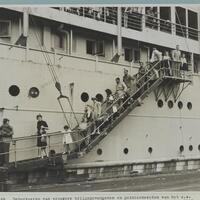 Debarkeren van voormalig krijgsgevangenen en geïnterneerden van het stoomschip Oranjefontein in de Victoria-docks te Melbourne Note Vanuit Melbourne werden deze mensen verder getransporteerd naar speciaal ingerichte rustkampen in Australië. |