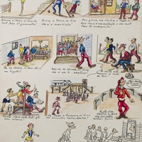 pen and ink, brush and wash on paper Description Left unfinished, this is the third cartoon in a series of four showing the tribulations that the fictional Signor F. S. Internati goes through every day at the Australian internment camps - especially to do with the gossip of the other internees. Description A cartoon depicting an enormous fight that has broken out amongst the internees in the Loveday Internment Camp, South Australia. The men are hitting, pushing and climbing over each other in an attempt to get inside one of the buildings. Dionysus, the god of wine, presides over the scene and proclaims "In Vino Veritas" ["In Wine, Truth"]. Description Depicts a drawing of a single man in a bare, solitary prison cell. Bereft, he sits leaning against one of the walls with his head bowed. Internmnet at Long Bay assembled a mix of Italians from various professions, many of whom offered skills to help occupy fellow internees. Professor Lamberto Yonna, who organised Italian classes in the camps, provided many Italians with their first opportunity to become literate. Despite being an Italian internee (i.e. not a POW) Lamberto Yonna was interned at POW camps at Long Bay, Liverpool and Orange in New South Wales and at Loveday in South Australia for 4 years. Most of his sketches made during his internment illustrate his lively sense of humour, humanity and lack of bitterness. This work, however, reveals something of the social isolation and lonliness experienced by internees and POWs. He was an accomplished artist, conducting art classes in the camp and painting back drops for theatrical productions staged by his fellow internees. One of the largest problems for Italian internees and POWs was limited communication with their families due to inadequate mail services to Italy. Long Bay prison and state reformatory was used to house POWs during the Second World War. |