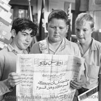 Students from the Oxley High School, Tamworth, NSW, examine a copy of the Malaysian newspaper "Utusan Melayu"